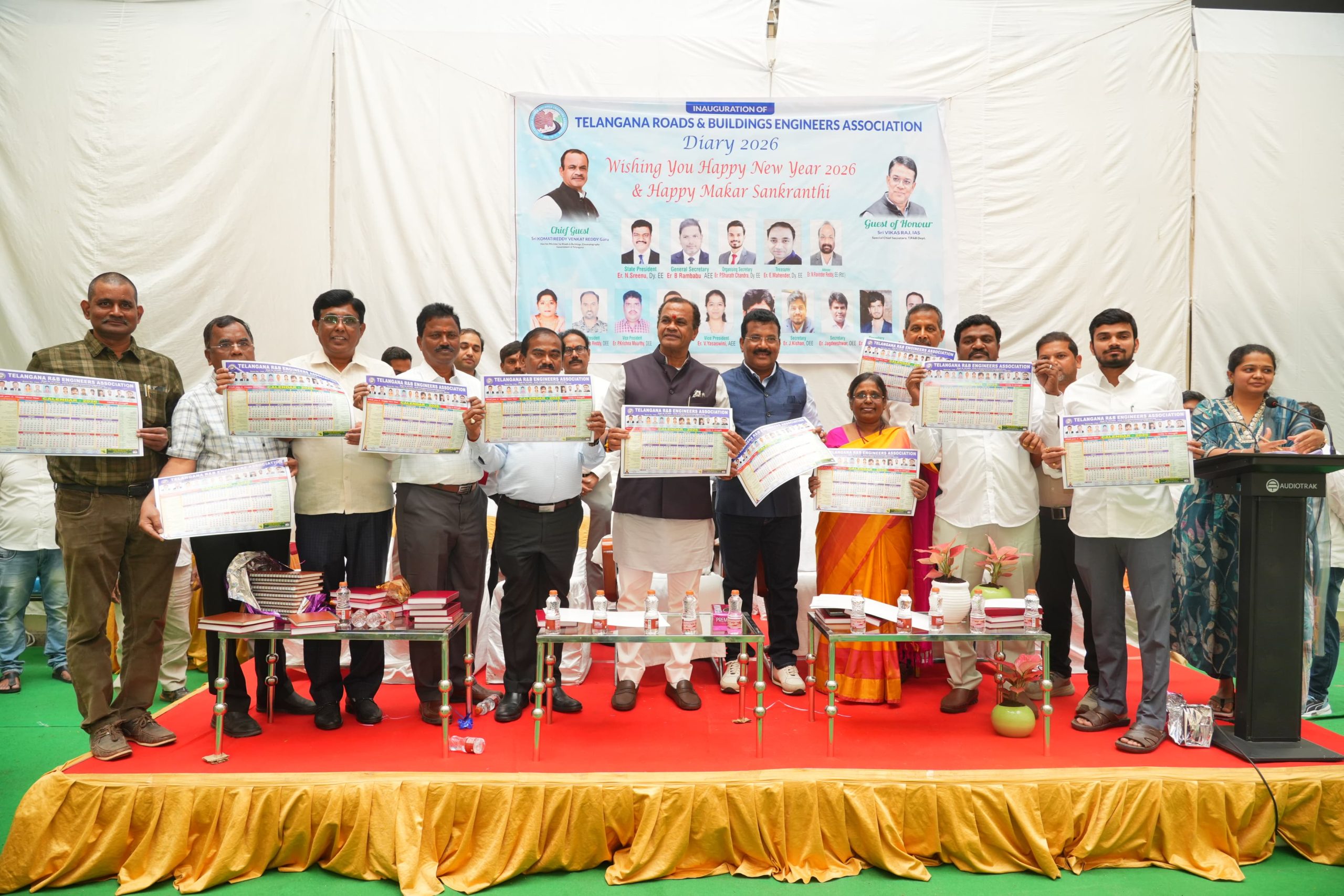 రోడ్లు, భవనాల శాఖ (R&B) అధికారులు, ఉద్యోగులు తనకు కుటుంబ సభ్యులతో సమానమని రాష్ట్ర రోడ్లు భవనాలు, సినిమాటోగ్రఫీ శాఖ మంత్రి కోమటిరెడ్డి వెంకట్ రెడ్డి అన్నారు. నూతన సంవత్సరం మొదటి రోజే డైరీ, క్యాలెండర్ను ఆవిష్కరించుకోవడం ఈ శాఖ పనితీరుకు, క్రమశిక్షణకు నిదర్శనమని ఆయన కొనియాడారు. గురువారం ఎర్రమంజిల్ లోని ఆర్ అండ్ బి ప్రధాన కార్యాలయంలో తెలంగాణ రోడ్లు, భవనాల ఇంజనీర్ల సంఘం ఆధ్వర్యంలో జరిగిన నూతన సంవత్సర వేడుకలకు మంత్రి ముఖ్య అతిథిగా హాజరయ్యారు. ఈ సందర్భంగా ఉద్యోగులతో కలిసి కేక్ కట్ చేసి, 2026 నూతన సంవత్సర డైరీ, క్యాలెండర్లను ఆవిష్కరించారు. అనంతరం ఏర్పాటు చేసిన సభలో మంత్రి మాట్లాడుతూ కీలక వ్యాఖ్యలు చేశారు.